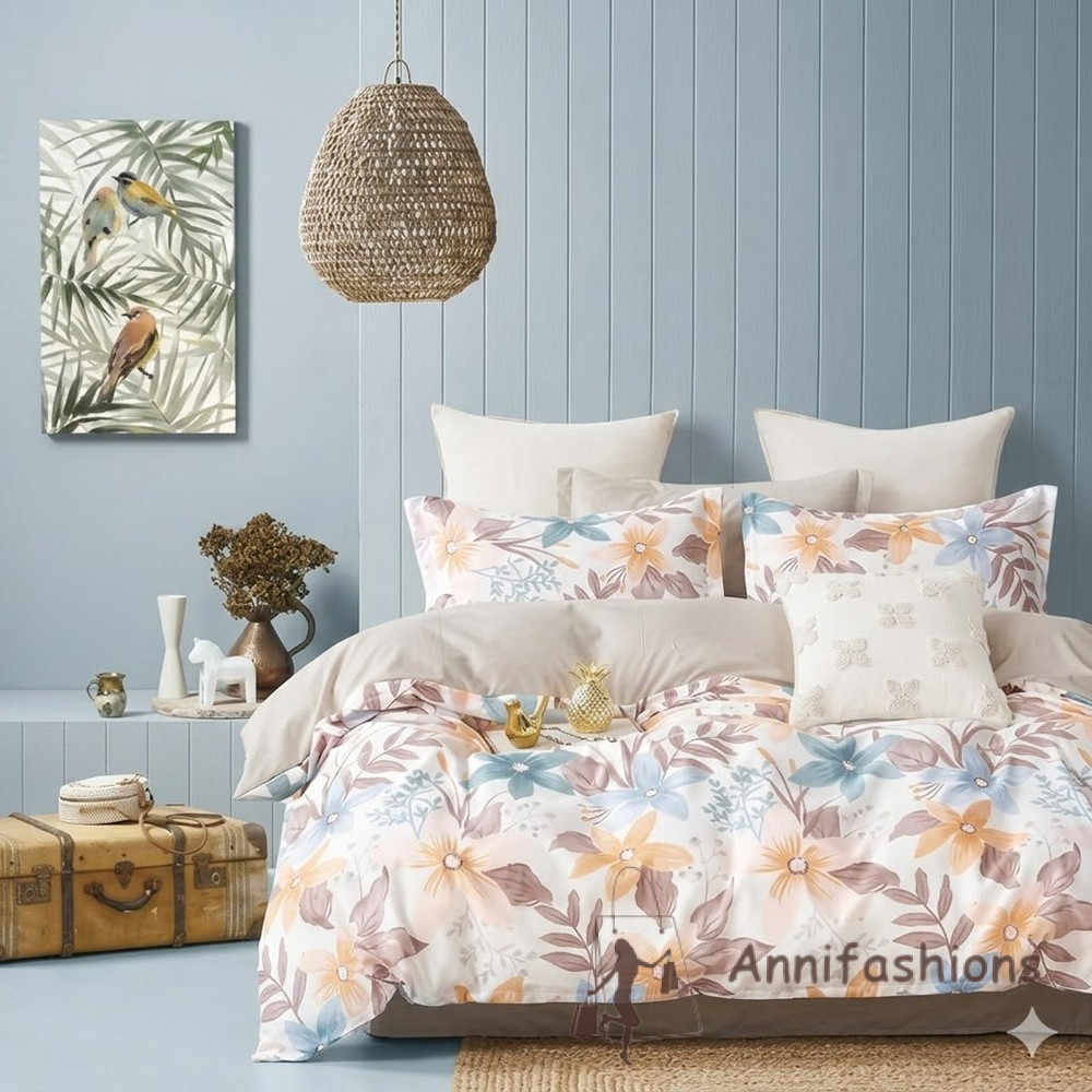 Alakítsa át hálószobáját a béke szigetévé! Ez a 7 részes ágyneműgarnitúra nemcsak esztétikai élményt nyújt a finom kék, barack és mályva színeivel, hanem teljes körű megoldást kínál egy franciaágy stílusos felöltöztetéséhez.