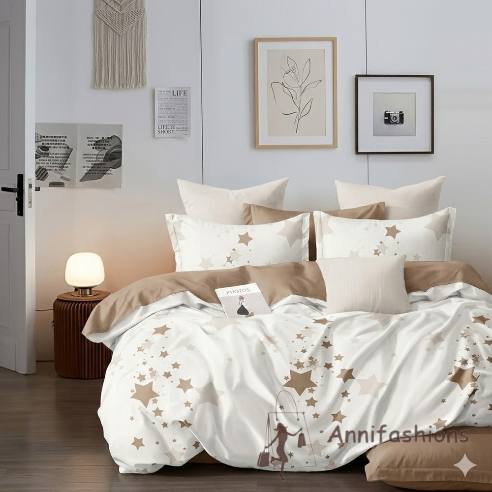 Frissítse fel hálószobája stílusát egyetlen mozdulattal! Ez a 7 részes ágynemű garnitúra ideális választás franciaágyakra, hiszen minden szükséges huzatot tartalmaz a teljes harmóniához. A szett különlegessége a kettős színvilág: az egyik oldalon lágy krém alapon szórt csillagok, míg a kontrasztos elemeken (például a lepedőn vagy a párnák hátoldalán) megnyugtató tejeskávé-barna szín dominál.