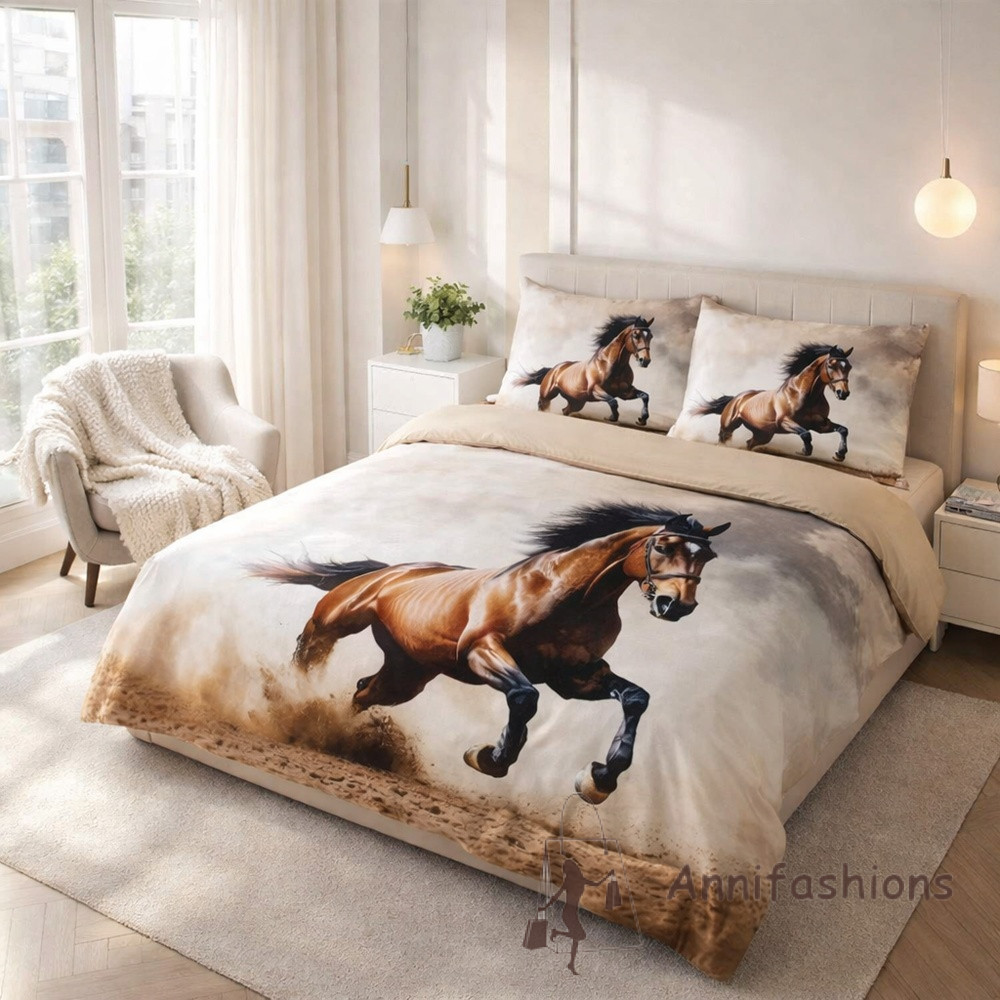 Hozd el a szabadság és az erő érzését a hálószobádba ezzel a lenyűgöző, vágtató lovat ábrázoló ágyneműszettel! A részletgazdag, 3D hatású grafika élethű megjelenést biztosít, amely azonnal magára vonzza a tekintetet, és különleges hangulatot teremt a térben.